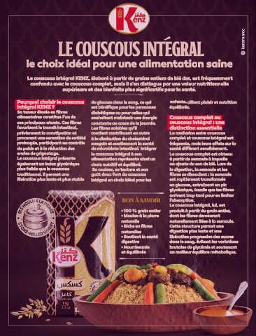 Le couscous intégral KENZ, élaboré à partir de grains entiers de blé dur, est fréquemment