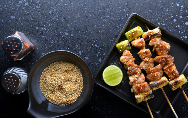- Piquez les morceaux de poulet sur des brochettes en bois